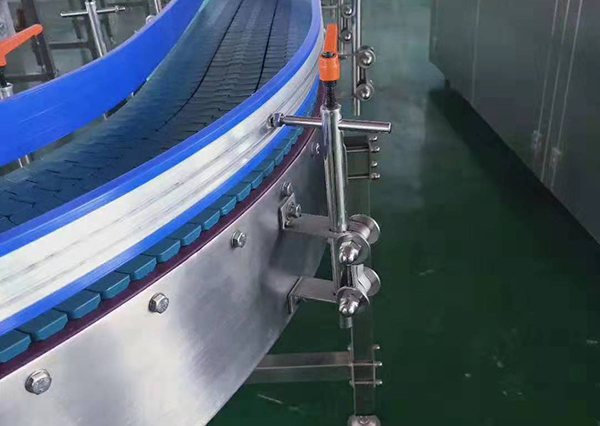 礦泉水自動灌裝生(shēng)產(chǎn)線瓶子由通過風送道傳遞,然後通過撥瓶星輪傳送至三合一機的衝(chōng)瓶機。衝瓶機(jī)回轉盤上裝(zhuāng)有瓶夾,瓶夾夾住瓶口沿一導軌翻轉180°,使瓶(píng)口向下。在衝瓶機特定區域,衝瓶夾噴嘴噴出衝瓶水(shuǐ),對瓶子內(nèi)壁進行衝(chōng)洗。瓶子經衝洗、瀝幹後在瓶夾夾持下沿導軌再(zài)翻轉180°,使(shǐ)瓶口向上。洗淨後的瓶子通過撥瓶星輪由衝瓶機導出並傳送至灌裝機。進入灌裝機(jī)的瓶子由瓶頸托(tuō)板卡住並在凸輪作用下將(jiāng)瓶(píng)子上(shàng)升,然後由瓶口將灌裝(zhuāng)閥頂(dǐng)開。灌裝采用重力灌裝方式。灌裝閥打開後物料通過灌裝(zhuāng)閥(fá)完成灌裝過程,灌裝結束後瓶(píng)口下(xià)降離開灌裝閥,瓶子通過卡瓶頸過渡撥輪進入旋(xuán)蓋機。旋蓋機上的止(zhǐ)旋刀卡(kǎ)住瓶頸(jǐng)部位,保(bǎo)持瓶子直立並防止旋轉。旋蓋頭在旋蓋機上保(bǎo)持公轉並(bìng)自轉,在凸輪作用下實現抓蓋、套蓋、旋蓋(gài)、脫(tuō)蓋動作,完成整個封(fēng)蓋過程。成(chéng)品瓶通過出瓶撥輪(lún)從旋蓋機傳送到(dào)出瓶輸(shū)送鏈上,由輸送鏈傳送出三合一機。